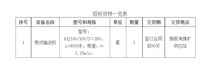 2.1 項(xiàng)目概況、招標(biāo)范圍及標(biāo)段(包)劃分:本項(xiàng)目招標(biāo)范圍包括帶式輸送機(jī)的供貨、運(yùn)輸及相關(guān)服務(wù)。(具體標(biāo)包劃分、交貨時(shí)間、交貨地點(diǎn)及設(shè)備名稱、技術(shù)規(guī)格、數(shù)量等技術(shù)參數(shù)見《招標(biāo)貨物一覽表》)