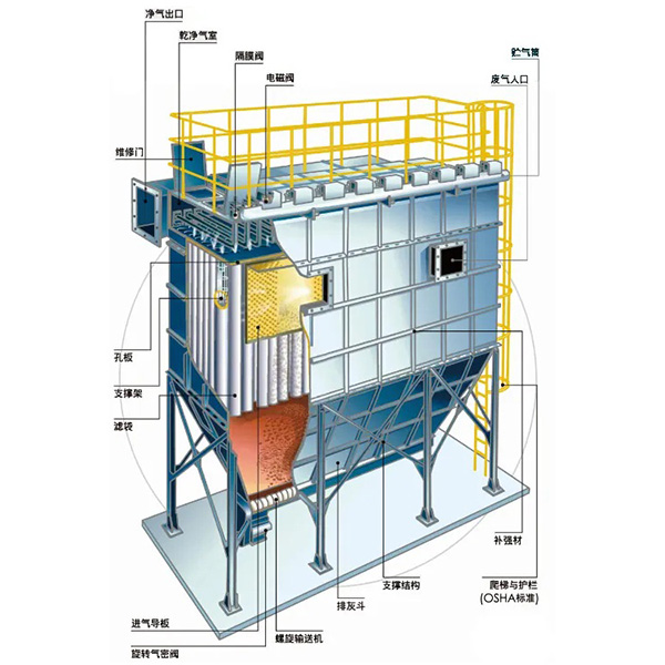 1、長袋離線脈沖袋式除塵器為箱體結(jié)構(gòu),主要由桁架、灰斗、中部箱體、上部箱體、噴吹裝置、梯子及平臺(tái)、進(jìn)出口風(fēng)管、PLC控制系統(tǒng)八部分組成。
