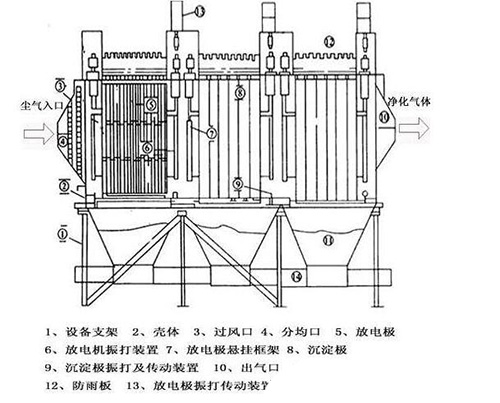 金屬放電線(xiàn)在直流高電壓的作用下,將其電極周?chē)鷼怏w電離,使粉塵或霧滴粒子表面荷電,也是讓粉塵顆粒帶電,而集塵極,也是濕式電除塵器中的管或板,帶有相反電極,荷電粒子在電場(chǎng)力的作用下向收塵極運(yùn)動(dòng),并沉積在收塵極上,水流從集塵板頂 端流下,在集塵板上形成一層均勻穩(wěn)定的水膜,將板上的顆粒帶走。
