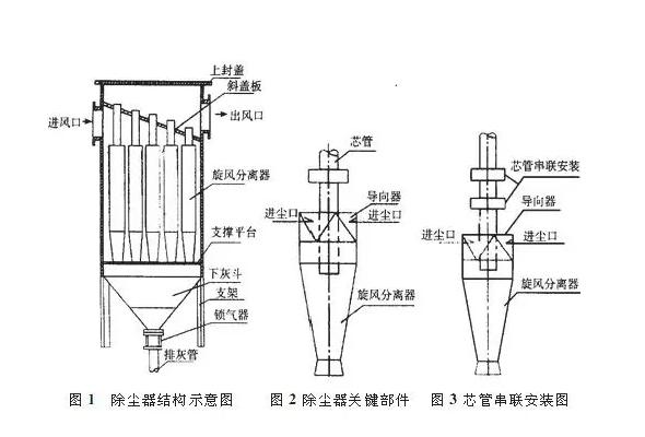 XLGIA(B)型除塵器是采用多級切向進氣旋風除塵,當含塵氣體進入入口后順流分散至各陶瓷了導向器,于子內塵氣旋轉,離心力作用使粉塵分離,粉塵降落子集塵箱內,經(jīng)鎖氣器排出,清潔氣體由排氣管排出。